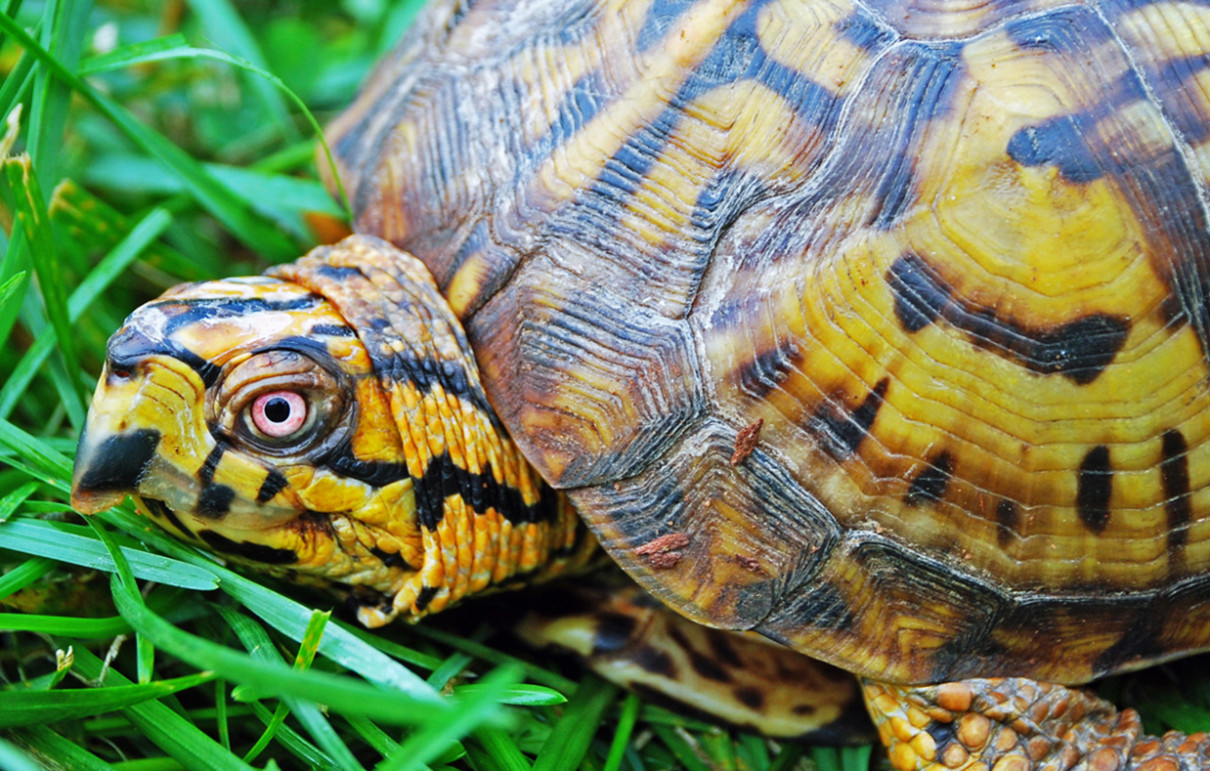 Eastern box turtles are a relatively small turtle, growing up to 8 inches in length. Their darker shell is high and domed with splotches of yellow and orange. These splotches form a pattern across the carapace, or top of shell, which will fade as the turtle matures. The unique pattern that forms can actually be used to distinguish between individuals in a population. Females tend to be duller in color when compared to males. Males have brighter colors, reddish/orange eyes, and a more concave plastron, while females are typically much duller and have yellow/brown eyes. They have 5 toes on their front feet and 4 on their hind feet.