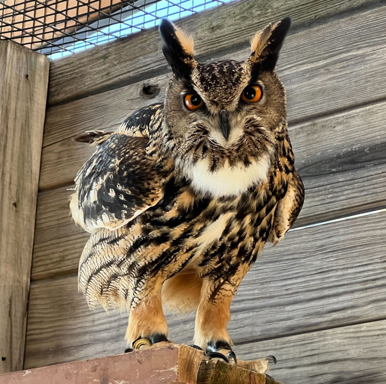 The Eurasian eagle owls are one of the largest most powerful owls in the world. They have distinct ear tufts, orange eyes, and mottled brown and white plumage. They can weigh between 3-9 lbs, are about 2-2.5 feet tall, and have a wingspan up to 6 feet in length.